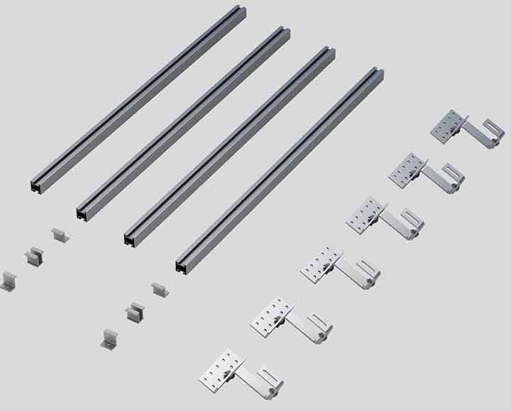 - Montagematerial (Haken, Schienen samt Schrauben und Klemmen) für Ziegeldach schräg ( parallel zum Dach )