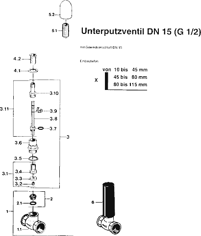 Unterputzteile Hansa 1/2" mit Präzisa-Spindel-Oberteil Gewindeanschluss G 1/2 (DN 15) Durchflussmenge: bis 30 l/min Armaturenkörper: entzinkungsarmes Messing (MS 63), auswechselbarer Ventilsitz Einbautiefe von 10 bis 45 mm Sichtteil bitte extra bestellen!