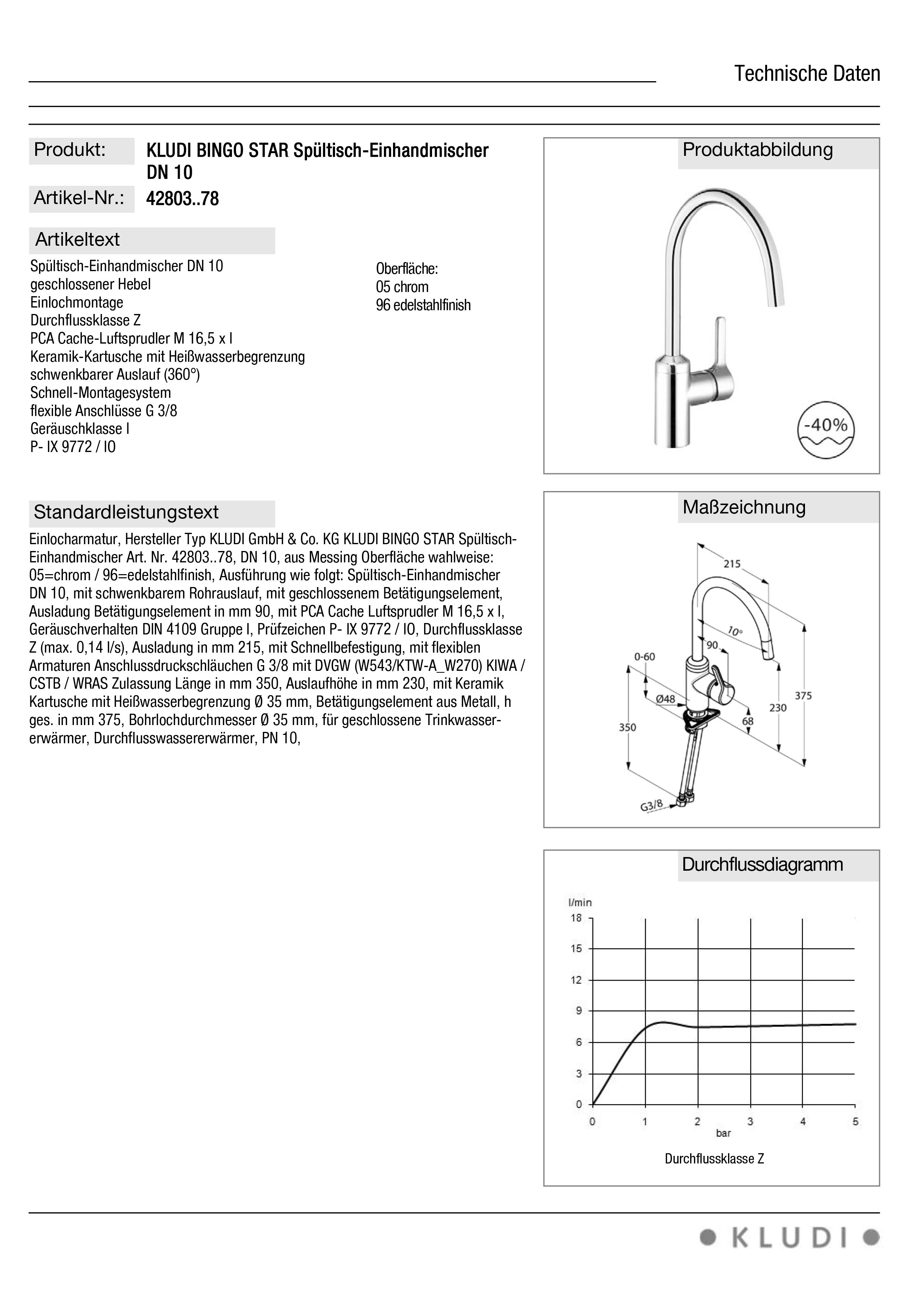 KLUDI BINGO STAR Spültisch-Einhandmischer aus Messing Oberfläche 96=edelstahlfinish, mit schwenkbarem Rohrauslauf, mit geschlossenem Betätigungselement, Ausladung Betätigungselement in mm 90, mit PCA Cache Luftsprudler M 16,5 x I, Geräuschverhalt en DIN 4109 Gruppe I, Prüfzeichen P- IX 9772 / IO, Durchflussklasse Z (max. 0,14 l/s), Ausladung in mm 215, mit Schnellbefestigung, mit flexiblen Armaturen Anschlussdruckschläuchen G 3/8 mit DVGW (W54 3/KTW-A W270) KIWA / CSTB/ WRAS Zulassung Länge in mm 350, Auslaufhöhe in mm 230 , mit Keramik Kartusche mit Heißwasserbegrenzung D 35 mm, Betätigungselement aus Metall, h ges. in mm 375, Bohrlochdurch messer D 35 mm, für geschlossene Trinkwassererwärmer, Durchflusswassererwärmer, PN 10