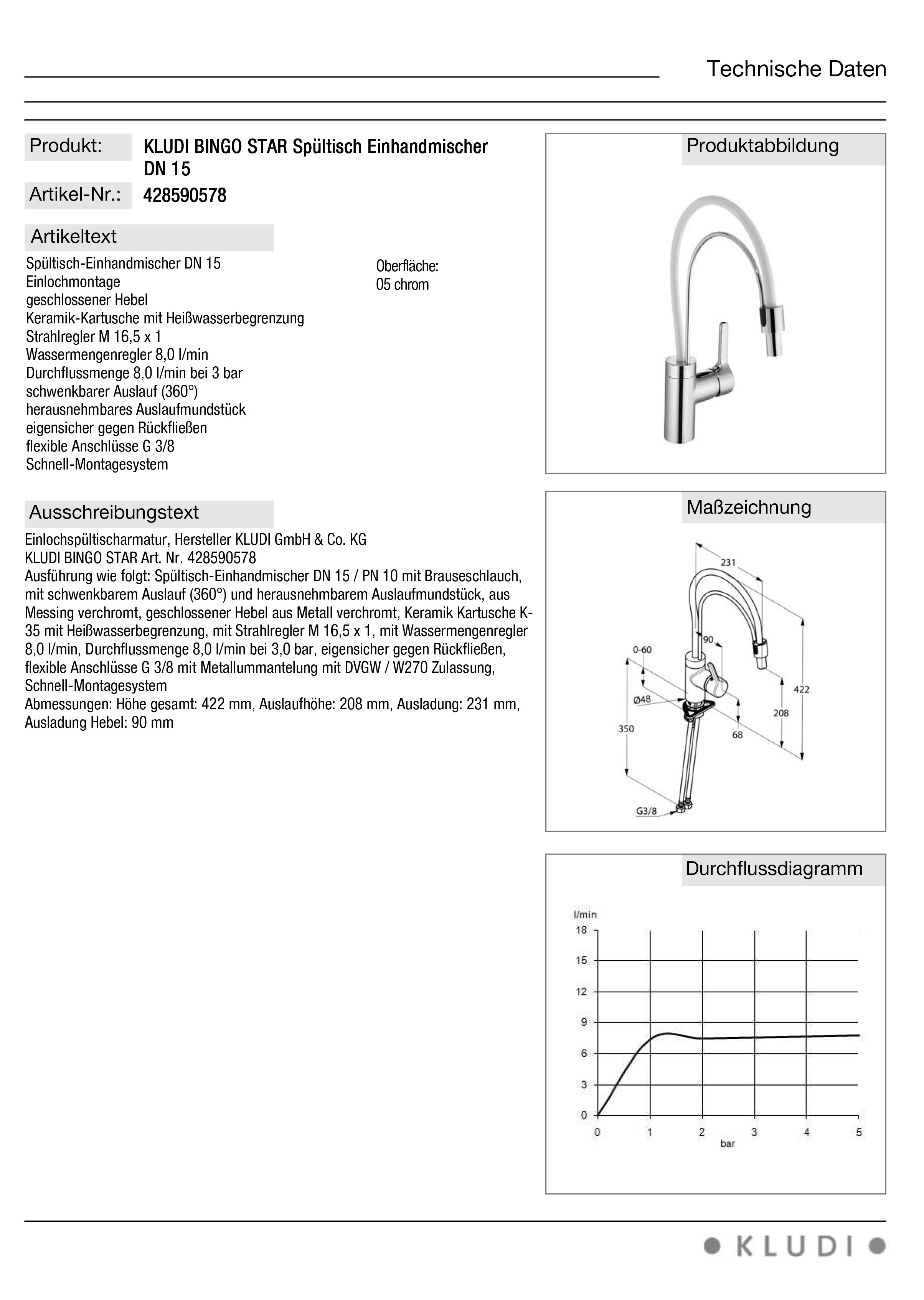 Kludi Einlochspültischarmatur KLUDI BINGO STAR mit Brausseschlauch mit schwenkbarem Auslauf (360 Grad) und herausnehmbarem Auslaufmundstück aus Messing verchromt geschlossener Hebel aus Metall verchromt Keramik Kartusche K-35 mit Heißwasserbeg mit Strahlreg ler M 16,5 x 1 mit Wassermengenregler 8, 0 l/min Durchflussmenge 8,0 l/min bei 3, 0 bar eigensicher gegen Rückfließen flex ible Anschlüsse G 3/8 mit Metallummantel ung mit DVGW / W270 Zulassung Schnell-Mo ntagesystem Abmessungen: Höhe gesamt: 42 2 mm Auslaufhöhe: 208 mm Ausladung: 231 mm Ausladung Hebel: 90 mm