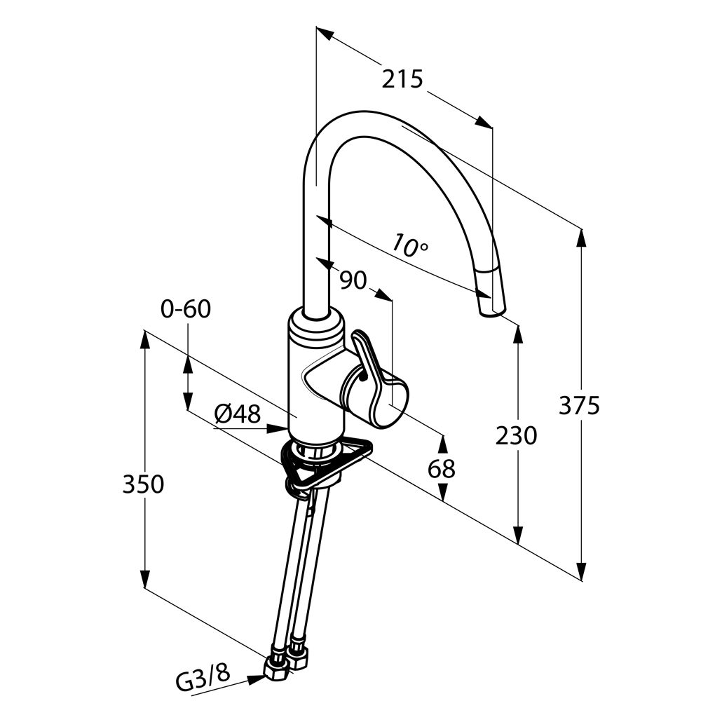 KLUDI BINGO STAR Spültisch-Einhandmischer aus Messing Oberfläche verchromt, mit schwenkbarem Rohrauslauf, mit geschlossenem Betätigungselement, Ausladung Betätigungselement in mm 90, mit PCA Cache Luftsprudler M 16,5 x I, Geräuschverhalt en DIN 4109 Gruppe I, Prüfzeichen P- IX 9772 / IO, Durchflussklasse Z (max. 0,14 l/s), Ausladung in mm 215, mit Schnellbefestigung, mit flexiblen Armaturen Anschlussdruckschläuchen G 3/8 mit DVGW (W54 3/KTW-A W270) KIWA / CSTB/ WRAS Zulassung Länge in mm 350, Auslaufhöhe in mm 230 , mit Keramik Kartusche mit Heißwasserbegrenzung D 35 mm, Betätigungselement aus Metall, h ges. in mm 375, Bohrlochdurch messer D 35 mm, für geschlossene Trinkwassererwärmer, Durchflusswassererwärmer, PN 10