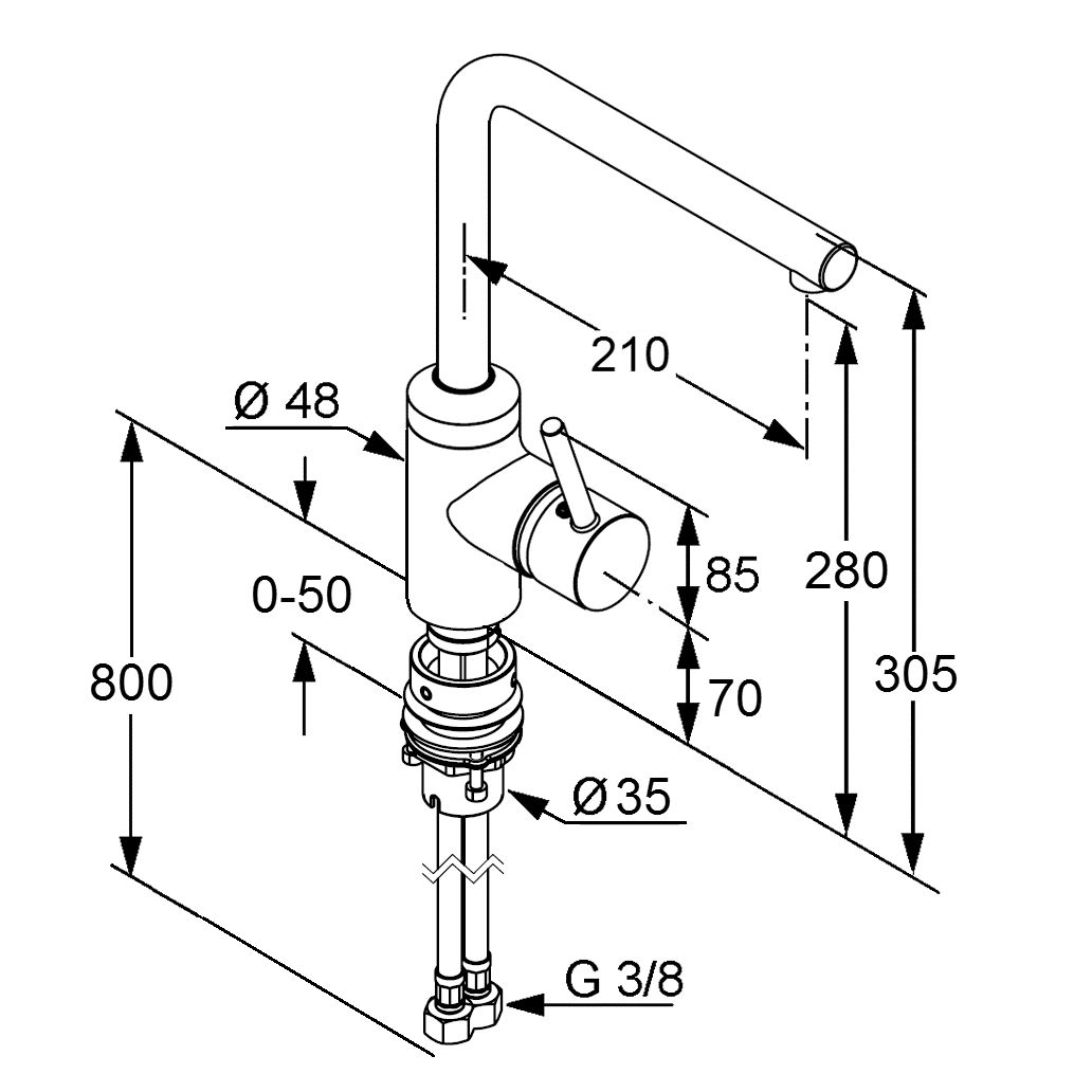 Kludi Einhand-Spültischbatterie L-INE Bajonett mit schwenkbarem Rohrauslauf, mit geschlossenem Betätigungselement, Ausladung Betätigungselement in mm 85, mit PCA Cache Luftsprudler M 16,5 x I, Geräuschverhalten DIN 4109 Gruppe I, ohne Prüfzeichen, Durchflussklasse Z (max. 0,14 l/s), Ausladung in mm 210, mit Schaftmutter, mit flexiblen Armaturen Anschlussdruckschläuchen G 3/8 mit DVGW (W543/KTW-A W270) KIWA / CSTB/ WRAS Zulassung Länge in mm 800, Auslaufhöhe in mm 275/300, mit Keramik Kartusche mit Heißwasserbegrenzung D 35 mm, Betätigungselement aus Metall, h ges. in mm 300, für Bohrlochdurchmesser D 35 mm, für Unterfenster Montage: verbleibende Sockelhöhe in mm 25, für geschlossene Trinkwassererwärmer, Durchflusswassererwärmer, PN 10