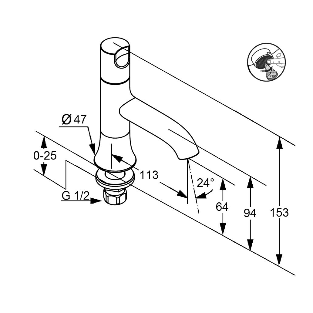 Kludi Standventil DN 15 für Kaltwasser, verchromt 38116 aus Messing verchromt, Keramik-Oberteil 90 Grad, Betätigungselement aus Metall verchromt, Geräuschverhalten DIN 4109 Gruppe I, ohne Prüfzeichen, Ausführung wie folgt: Standventil DN 15, Durchflussklasse Z (max. 0,15 l/s) mit festem Auslauf, mit s-pointer Eco Cache Luftsprudler M 18,5 x I, Ausladung bis 113 mm, Auslaufhöhe in mm 64/94, mit Schaftmutter, mit Überwurfmutter G 1/2, mit Zylindergriff, h ges. in mm 153