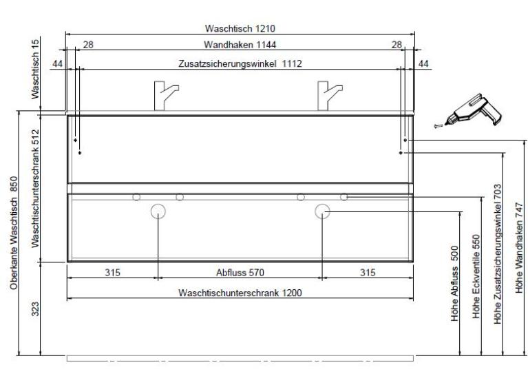 • Keramik Waschtisch mit integriertem Überlauf  Abmessungen: 1210 x T 465 mm