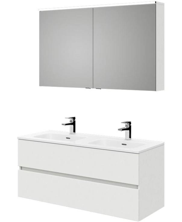 Formschöne grifflose Artiqua Badmöbel Kombination 1210 mm Waschtisch mit Unterbau und Spiegelschrank in drei verschiedenen Farbvarianten erhältlich.